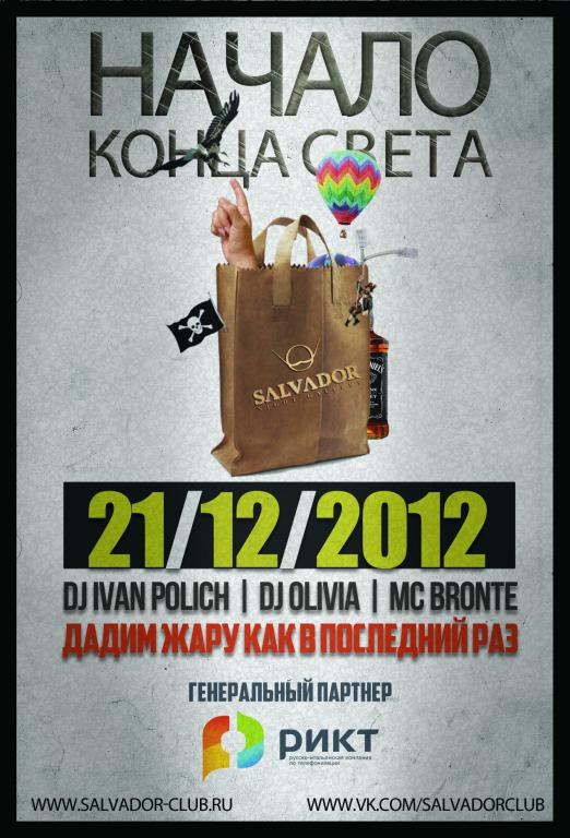 А ты готов принять участие в фееричной вечеринке в Сальвадоре? У тебя еще есть шанс попасть на самую зажигательную и незабываемую вечеринку «Начало конца света», которая состоится 21 декабря в night gallery «Сальвадор». В этот вечер для Вас будут играть dj ivan polich, dj Olivia, у микрофона mc bronte. Генеральный партнер вечеринки – ОАО «РИКТ».